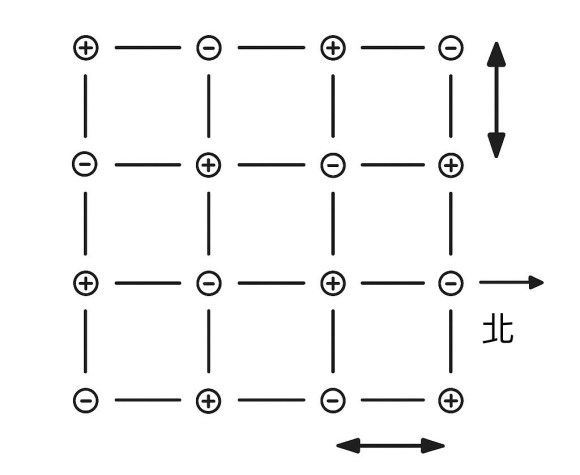 哈特曼地磁網格示意圖。圖片參考瑞歐內克斯公司書籍修改繪製。